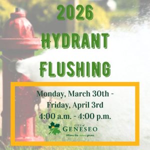 Geneseo Water Division personnel will begin hydrant-flushing the morning of March 30th. Hydrant flushing occurs between 4 am and 4 pm. Hydrant-flushing will end April 3rd. Water Division personnel will operate and verify proper operation of all the fire hydrants in the system. Personnel will start flushing on the north side of town and working their way from east to west as they move in a southward direction, street by street. During this time, customers may notice episodes of decreased water pressure or discoloration of their water. Discoloration may be seen throughout town and may not only affect the immediate area where flushing is taking place. We recommend that you refrain from doing white or light colored laundry while flushing is being done. Water discoloration results from temporary disturbances of the normal water flow within our piping network. These short-term changes in flow can stir up naturally occurring minerals and sediment that settles within the water mains. The objective of the water main/hydrant flushing program is to remove these accumulated sediments from our pipes by flushing the water out of the fire hydrants. Most of time, this will clear up by running water on cold for a few minutes. . If you have any questions, please call 309-944-6419 between the hours of 8:00 am and 4:00 pm.